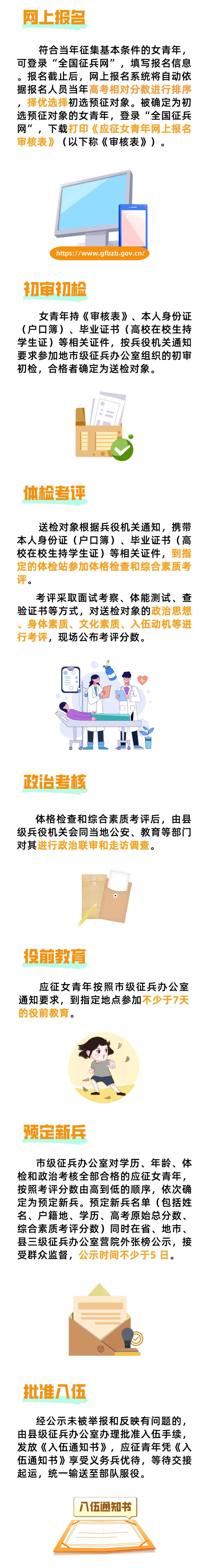 3. "征集时间":体检和政治审查合格的女兵将被征集入伍,征集时间通常在每年的10月至11月。