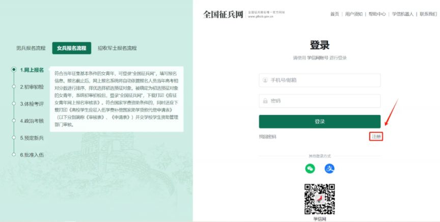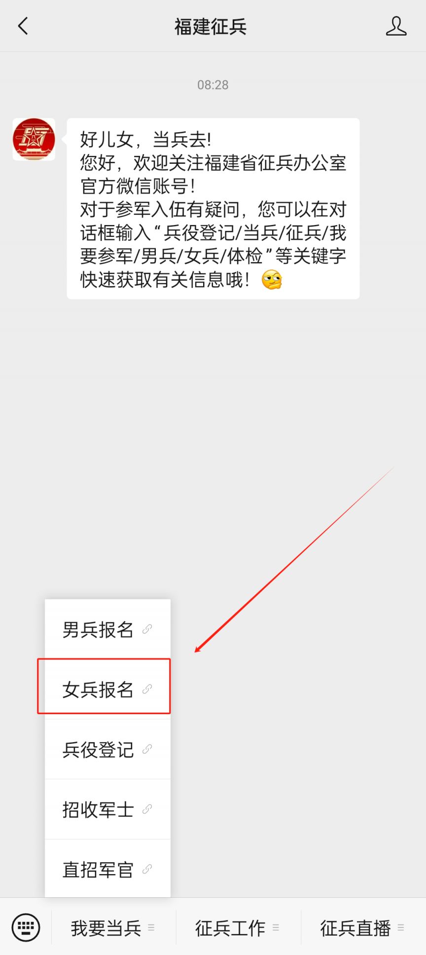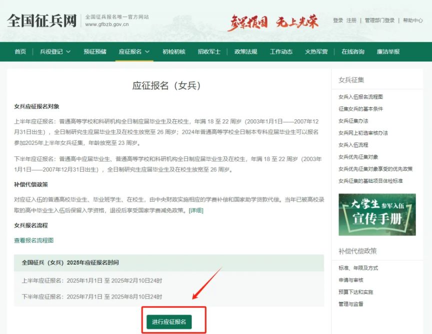 女兵报名通道电脑端 1、登录全国征兵网。 https://www.gfbzb.gov.cn/  2、进入这个界面之后,点击“进行应征报名”跳转。  3、如果此时还没有登录账号,会出现以下界面,用学信网账号进行登录就可以了。但如果没有学信网账号,请点击“注册”按钮,进行注册,注册完之后就可以登录了。 注:注册学信网账号必须实名,一定要用真实姓名和身份证认真填写,兵役机关将对有效信息进行审核。  4、登录系统以后,点击“参加2025年应征报名”,根据所提示的信息进行填写就可以啦!  完成以上步骤,就已经成功应征报名啦! 手机端 关注“福建征兵”,通过子菜单栏目“我要当兵”“女兵报名”进行应征报名。   女兵应征流程
