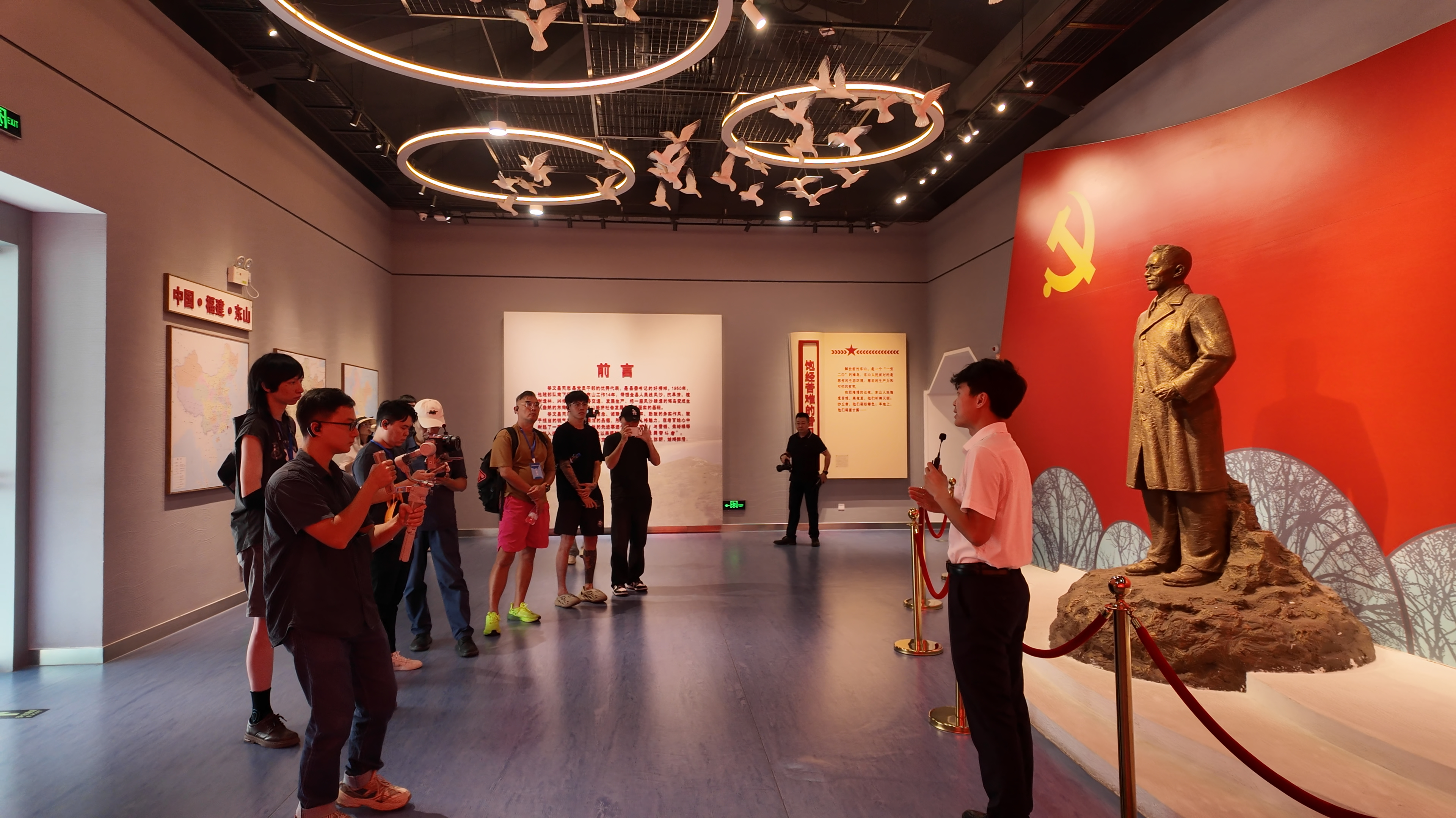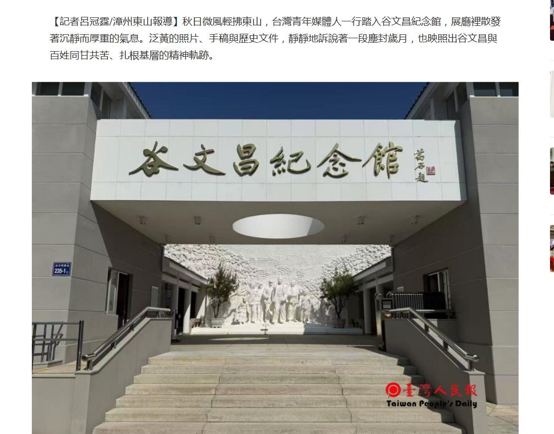 “真的难以相信,东山岛以前是一片沙漠,如今却是如此生机盎然。”在展区前,台湾媒体青年们停了下来,纷纷用手机和相机拍摄眼前的“景象”,并认真听讲解员的讲述。展厅内的老照片、治沙工具,以及如今东山岛绿意盎然的实景视频,直观展现了漳州生态文明建设的显著成效,也展示了东山人通过植树造林、修建水利等措施,阻挡风沙,让东山从“沙岛”变成“绿洲”的过程。在台湾人民报吕冠霆的报道中这么描述:“秋日微風輕拂東山,台灣青年媒體人一行踏入谷文昌紀念館,展廳裡散發著沉靜而厚重的氣息。泛黃的照片、手稿與歷史文件,靜靜地訴說著一段塵封歲月,也映照出谷文昌與百姓同甘共苦、扎根基層的精神軌跡。”